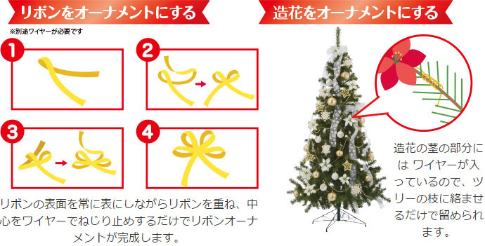 オーナメントの数 キレイで見栄えのよいクリスマスツリーを飾る ためには、適正な数量の飾り付けがポイントと なります。以下の表は、ツリーの表面積の20% をボールで飾る場合の目安適正数量となります。 20%のボールデコレーションをベースに、リボ ンやモールなどお好みのオーナメントを. 豪華なリボンの作り方 2種類のリボンで2重がけ! 同じ色の太さの異なるリボンを2種類使って、見た目は1本のリボンでおしゃれに結んだように見せる術です。 ダークカラーのラッピングペーパーに、赤系のサテンのリボンを組み合わせる と、大人っぽくてシックなギフトラッピングになります。 クリスマスツリーの選び方・飾り方 xmasプリザーブドグリーンご利用目安 花王pat カゴの中 最近チェックした商品.